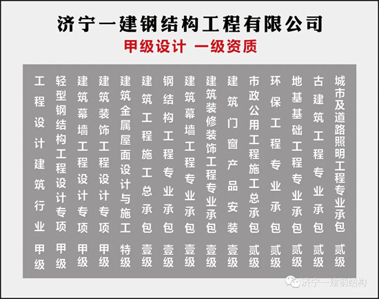 濟(jì)寧一建鋼結(jié)構(gòu)工程有限公司,隸屬中煤建設(shè)集團(tuán),集團(tuán)注冊資金1.0158億元人民幣,下設(shè)工程部、設(shè)計部、技術(shù)部、質(zhì)檢部、生產(chǎn)部、安全部。擁有鋼結(jié)構(gòu)施工、設(shè)計雙甲資質(zhì)、制造壹級資質(zhì),幕墻施工、設(shè)計雙甲資質(zhì),裝飾裝修施工、設(shè)計雙甲資質(zhì),建筑金屬屋面設(shè)計與施工特級資質(zhì),門窗施工壹級資質(zhì),并具有對外承包施工資質(zhì)和勞務(wù)輸出資質(zhì)等九項國家甲級資質(zhì)。主要從事鋼結(jié)構(gòu)網(wǎng)架工程、管桁架工程、裝配式輕鋼別墅工程、幕墻工程、膜結(jié)構(gòu)工程及大型儲罐工程的設(shè)計、生產(chǎn)與施工,公司相繼承攬了機(jī)場航站樓、體育場館、省級科技館、大型廠房、高速路服務(wù)站、國家石油儲庫、加油站、儲煤倉等各類工程,施工范圍涉及全國三十多個省、市、自治區(qū)及直轄市,工程質(zhì)量合格率100%,多年來榮獲國內(nèi)建筑界各類獎項100余個。